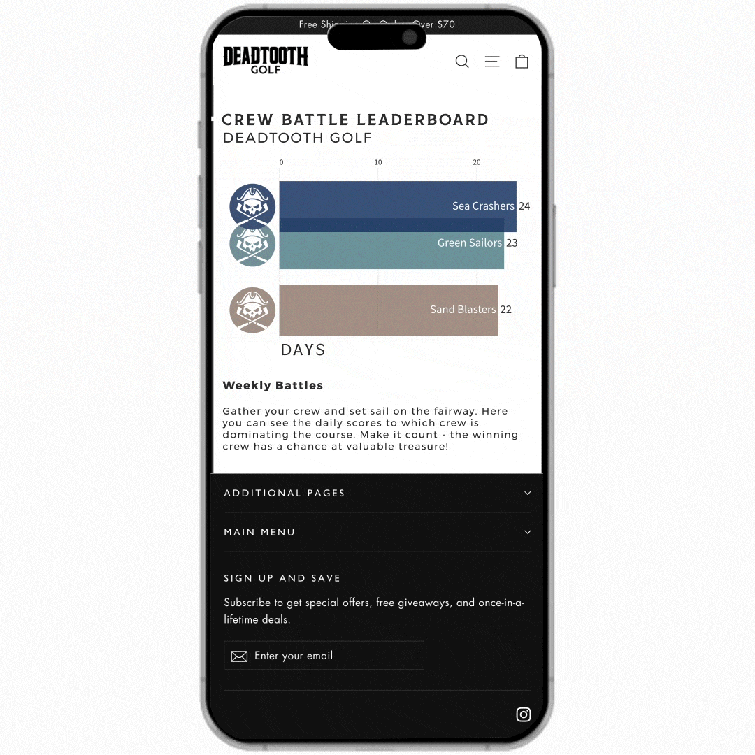 To earn a gift card, participate in our 'Crew Catch' challenge. If you’re spotted wearing Deadtooth Golf gear at a golf course or event, our crew might surprise you with a gift card! You can also tag us on Instagram with photos of you in your Deadtooth gear as part of our 'Spyglass Spot' challenge, which could lead to a reward. Keep your eyes open, and always be ready for a chance to win!